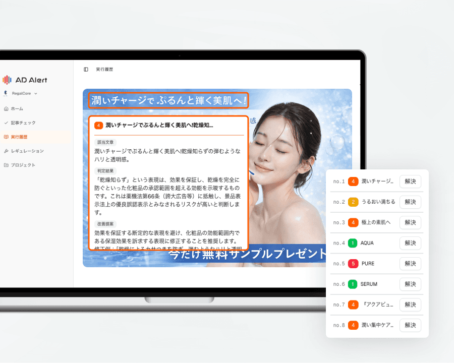 薬機法・景品表示法・特定商取引法に基づき、広告クリエイティブの表現チェックを実施。レギュレーション化しづらい独自性の高い商材でも、貴社の社内法務や社外弁護士に代わり薬機法・景表法に精通した弁護士が3営業日程度でチェック可能。