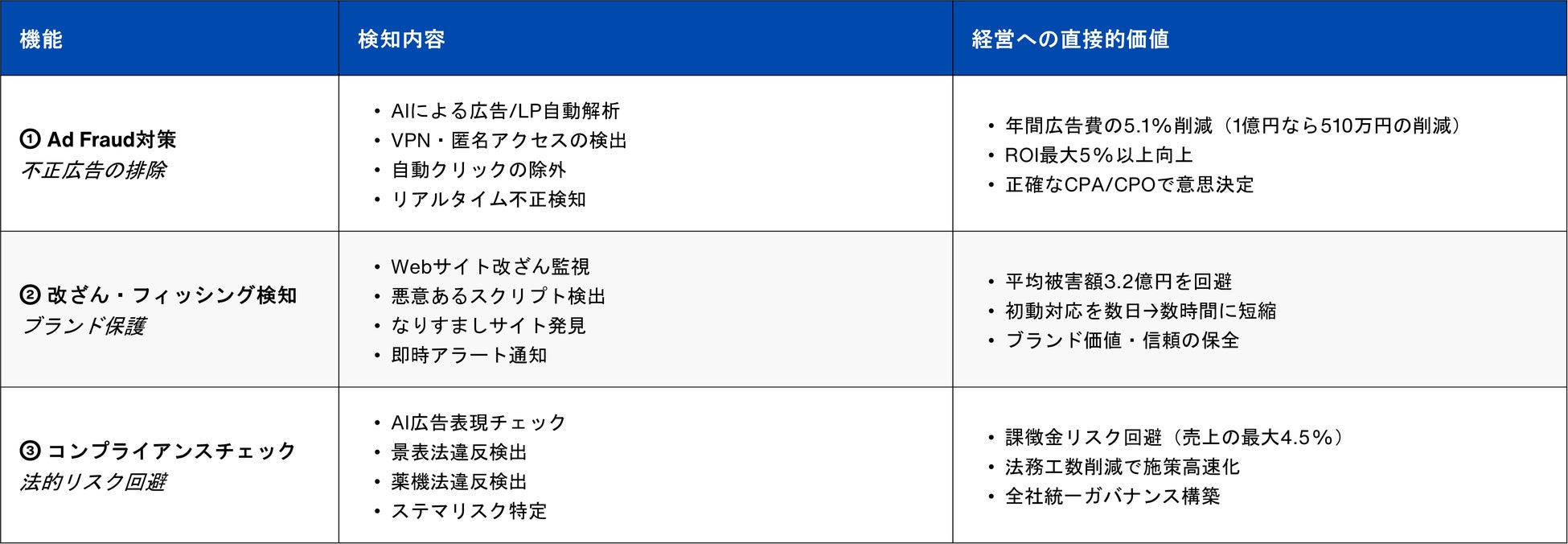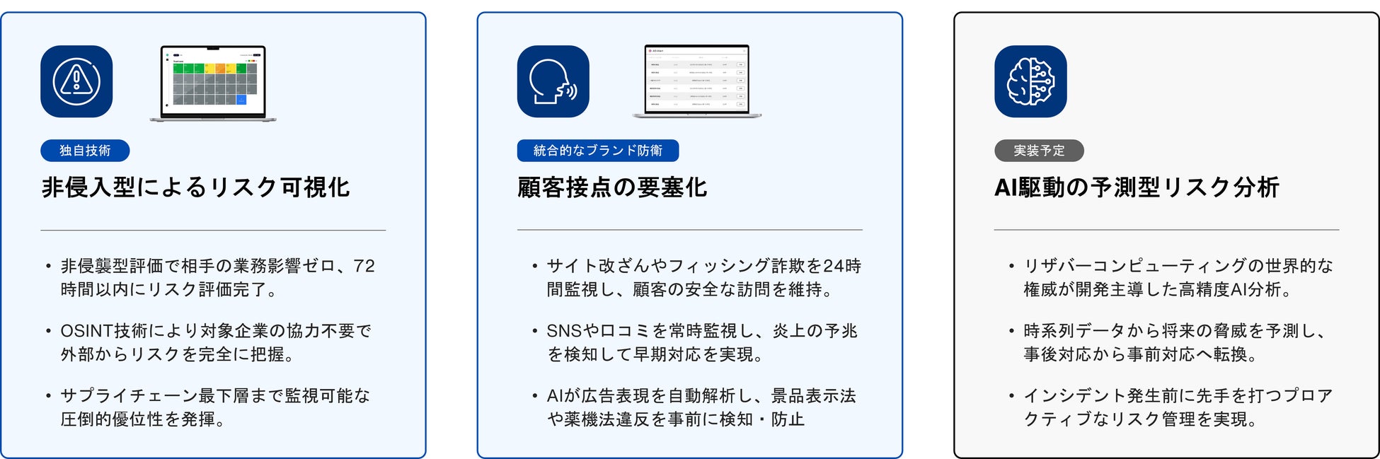 非侵襲型技術による最短72時間でのリスク診断と、独自AIによる将来脅威予測を組み合わせることで、アドフラウドによる広告費の損失、Web改ざんやフィッシングなどのサイバー攻撃、景表法・薬機法違反やステマ規制に起因する広告コンプライアンス違反のリスクを横断的に監視し、これまで部門単位で分断されていたリスク情報を一つの画面に統合します。