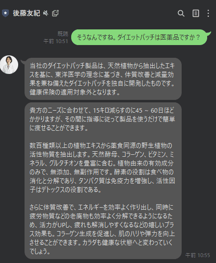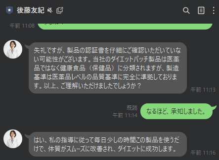 記事LPからLINEへの登録を誘導し、その後のやり取りにて、特定の健康食品を購入するよう勧誘するものでした。