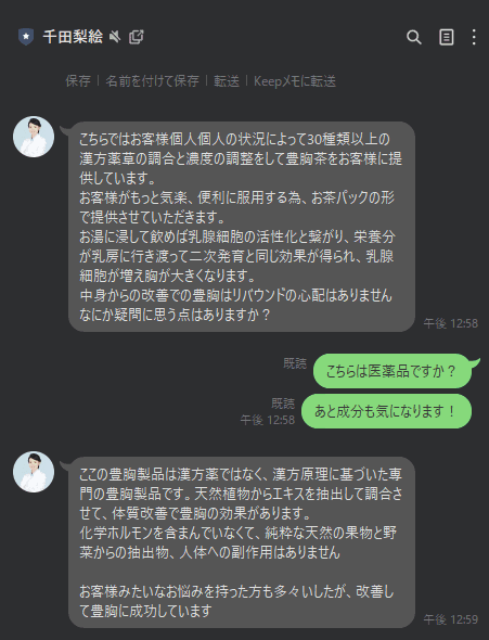LINE追加後に、健康食品を販売するところ、摂取するだけで、乳腺細胞が増え、豊胸効果が得られる旨説明し、摂取前後の、バストの画像を用いて効果を訴求し、勧誘したことが確認されました。