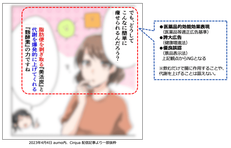 具体的には、ダイエット商材において「飲むだけで痩せる」「短期間で急激に痩せる」「飲むだけで脂肪燃焼できる」等の医薬品的効能効果表現に該当する表現がなされていたり、化粧品に分類される商材において「シミが消える/なくなる」「シミの漂白剤」等の承認外の効能効果表現に該当する表現がなされていたり、薬機法違反となり得る表現を多く確認しています。