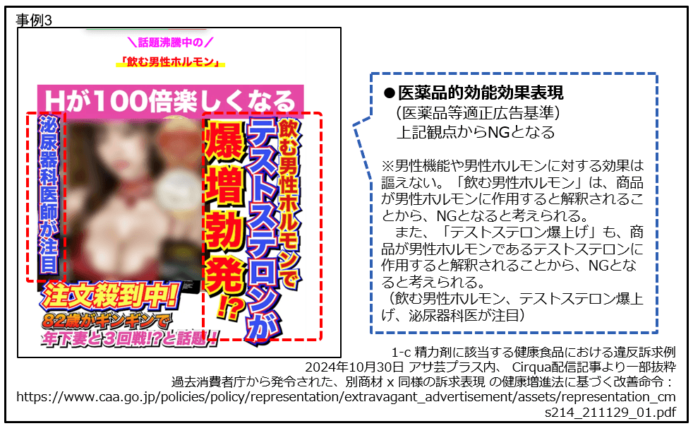 1. 健康食品に該当する商材について、医薬品的効能効果表現(薬機法)や誇大広告(健康増進法)もしくは優良誤認(景品表示法)に違反している表現