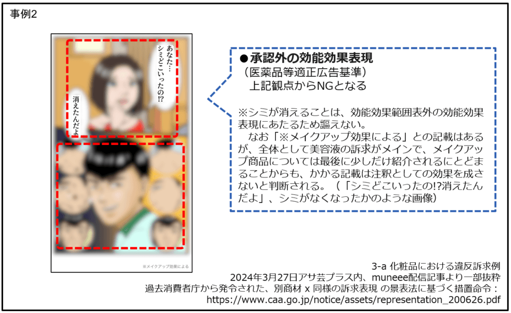 化粧品(薬用化粧品含む)に該当する商材について、医薬品等適正広告基準に違反している表現 a.効能効果範囲表を逸脱した効能効果を謳う表現 例1:除毛剤において、永久脱毛級、肌再生を促す、毛が生えづらくなる、毛が細くなる、などの抑毛効果と捉えられるような表現。 例2:石鹸類(洗顔・クレンジング・ボディソープ等)の商材において、毒素を排出、肌質そのものが変わる、炎症を防ぐ、(医薬部外品として殺菌の承認得ていないにもかかわらず)悪玉菌を退治する、などの表現。 例3:バストクリームにおいて、A→Fに急成長、2週間でGカップになれる、誰でもバストアップできる、などの表現や、BA画像を用いて塗るだけでバストが大きくなるかのような表現。 例4:しみに関する商材において、シミが消えた、シミが消滅、シミが無かったように、シミの洗剤/漂白剤、画像との組み合わせでシミがキレイになるような表現。 例5:医薬部外品ではないシワに関する商材において、シワは完全になくなった、しわがピーン!、などのシワがなくなるかのような表現。 例6:育毛剤において、塗る植毛、誰にもバレずに生やせる、などの表現や、BA画像により、あたかも髪が生えるかのような表現。また白髪が生えてこなくなる、白髪ケア、などの白髪に効果があるかのような表現。 例7:医薬部外品ではないまつ毛美容液に該当する商材において、まつ育、まつげが伸びた、育毛剤、まつげを生やす、などのまつ毛の育毛効果や発毛効果があるかのような表現。 例8:【追加指摘】歯みがき類において、ブラッシング効果である旨の記載なしに歯を白くするかのような表現(マウスウォッシュ商材)。また、物理的効果ではなく成分にて抗菌作用があるかのような表現。 例9:シャンプーやコンディショナーに該当する商材について、髪質の変化、黒髪の育成、などのあたかも髪質改善や育毛効果があるかのような表現 例10:化粧品(薬用化粧品含む)に該当する商材について、その他謳うことのできない効果があるかのような表現。皮膚のたるみを解消する、ポツポツをケアする、細胞を含めて若返らせる、アンチエイジング効果がある、などの表現。