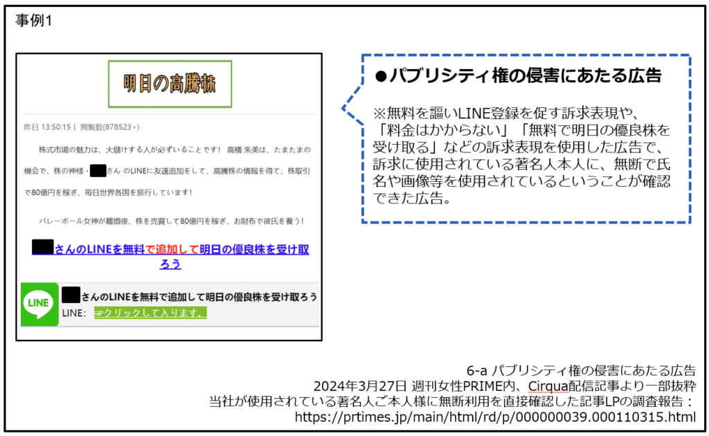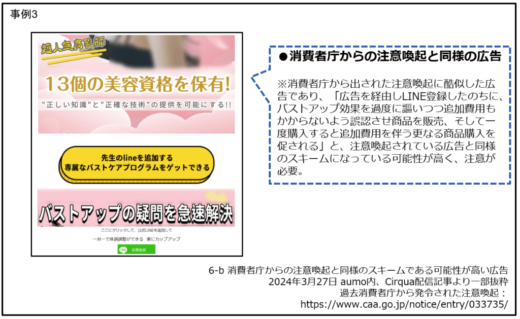 その他、薬機法や景表法以外の法令等に違反している表現や、消費者庁から過去に指摘/注意喚起されている表現 a.パブリシティ権の侵害にあたる広告(著名人の名前や画像等を無断利用していることが明確に判明している広告) b.過度の痩身効果もしくはバストアップ効果、並びに追加費用がかからない旨を謳い、LINE登録を勧誘する広告(消費者庁が注意喚起している内容に酷似した広告)