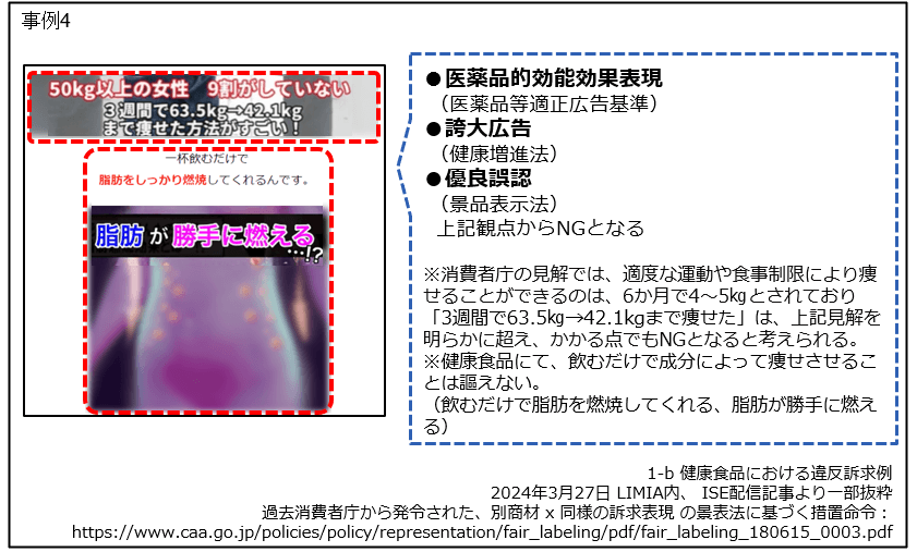 健康食品に該当する商材について、医薬品的効能効果表現(薬機法)や誇大広告(健康増進法)もしくは優良誤認(景品表示法)に違反している表現 a.本来謳えない、部位や身体の機能に対する効果を謳っている表現 例1:女性ホルモンの働きを活かす、胸に張りを出す、おっぱいだけムチムチ、誰でもムチムチ美乳になれる、女性ホルモンサポート 例2:(髪を指して)つやサラ、(肌を指して)ぷるん、デトックス効果、身体の酸化を防ぐ b.飲むだけで痩せ、また過度に痩せることを謳っている表現 例:必ず痩せることができる、脂肪便を排出させる、代謝を上げてくれる、脂肪を燃焼させる、痩せ体質になれる、2週間で13.1kgの減量、BA画像との組み合わせで過度に痩せるような表現 c.飲むだけで男性機能を向上させるかのような表現 例:飲む男性ホルモン、性欲爆上げ、テストステロン爆上げ、更年期卒業