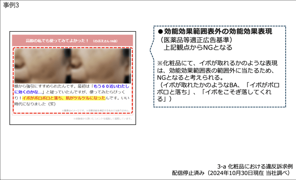 例10:化粧品(薬用化粧品含む)に該当する商材について、その他謳うことのできない効果があるかのような表現。皮膚のたるみを解消する、ポツポツをケアする、細胞を含めて若返らせる、アンチエイジング効果がある、などの表現。医薬品に該当する商材について、医薬品等適正広告基準に違反している表現