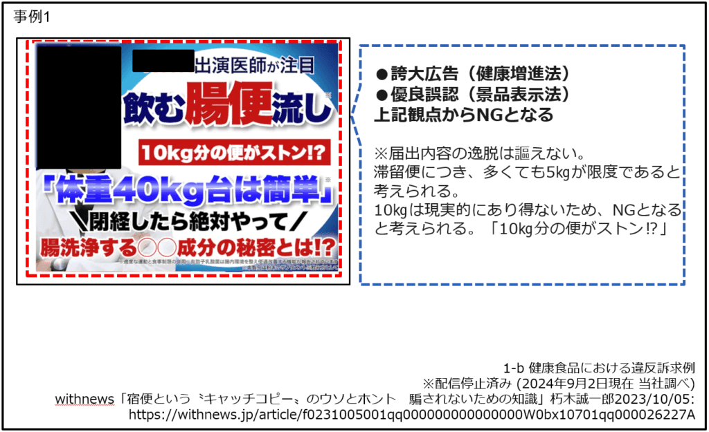1. 健康食品に該当する商材について、医薬品的効能効果表現(薬機法)や誇大広告(健康増進法)もしくは優良誤認(景品表示法)に違反している表現