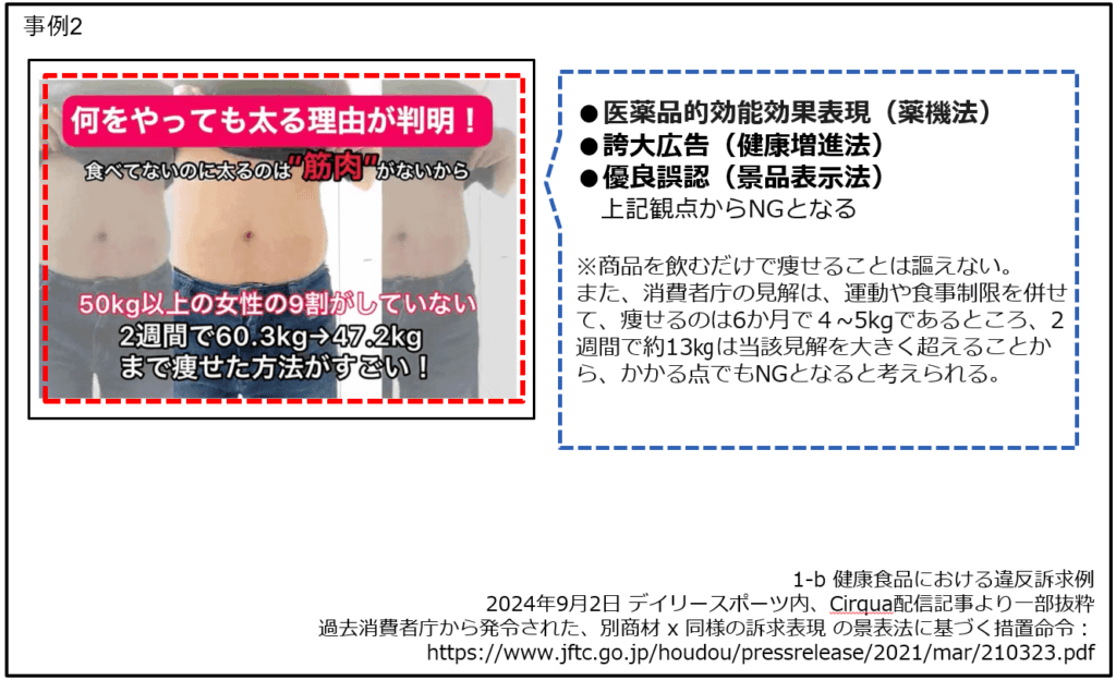2. 機能性表示食品に該当する商材について、誇大広告(健康増進法)もしくは優良誤認(景品表示法)に違反している表現