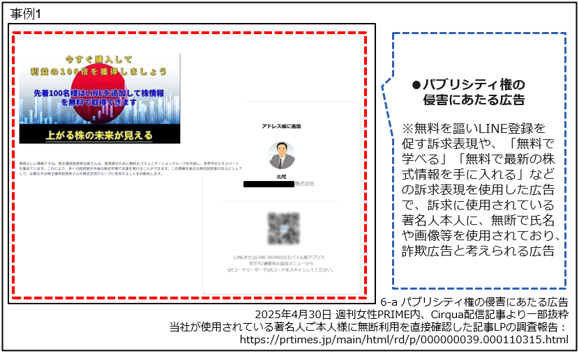 a. パブリシティ権の侵害にあたる広告(著名人の名前や画像等を無断利用していることが明確に判明している広告)