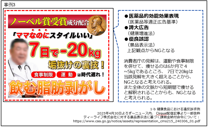 1. 健康食品に該当する商材について、医薬品的効能効果表現(薬機法)や誇大広告(健康増進法)もしくは優良誤認(景品表示法)に違反している表現