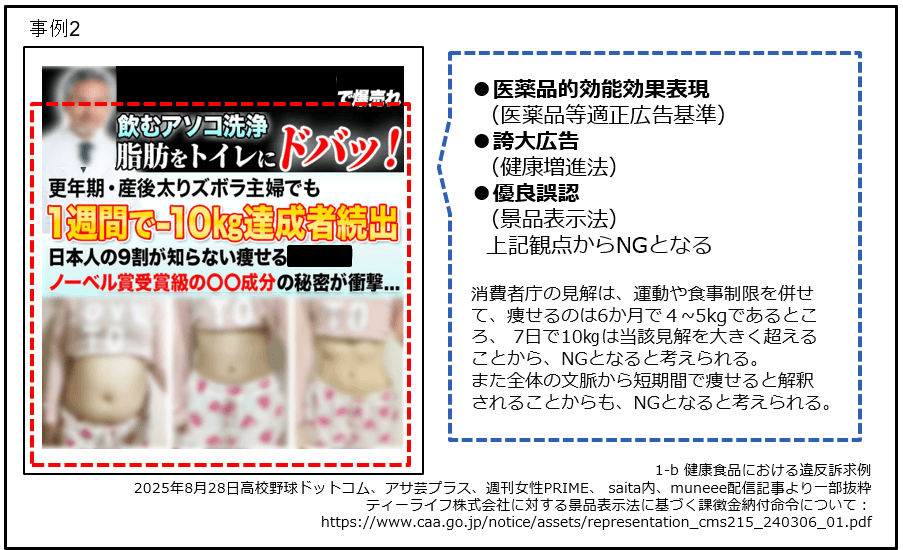 2. 機能性表示食品に該当する商材について、誇大広告(健康増進法)もしくは優良誤認(景品表示法)に違反している表現