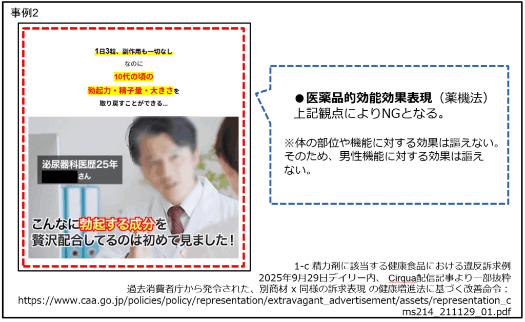 2. 機能性表示食品に該当する商材について、誇大広告(健康増進法)もしくは優良誤認(景品表示法)に違反している表現