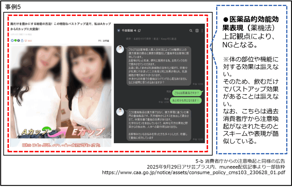 b. 過度の痩身効果もしくはバストアップ効果、並びに追加費用がかからない旨を謳い、LINE登録を勧誘する広告(消費者庁が注意喚起している内容に酷似した広告)