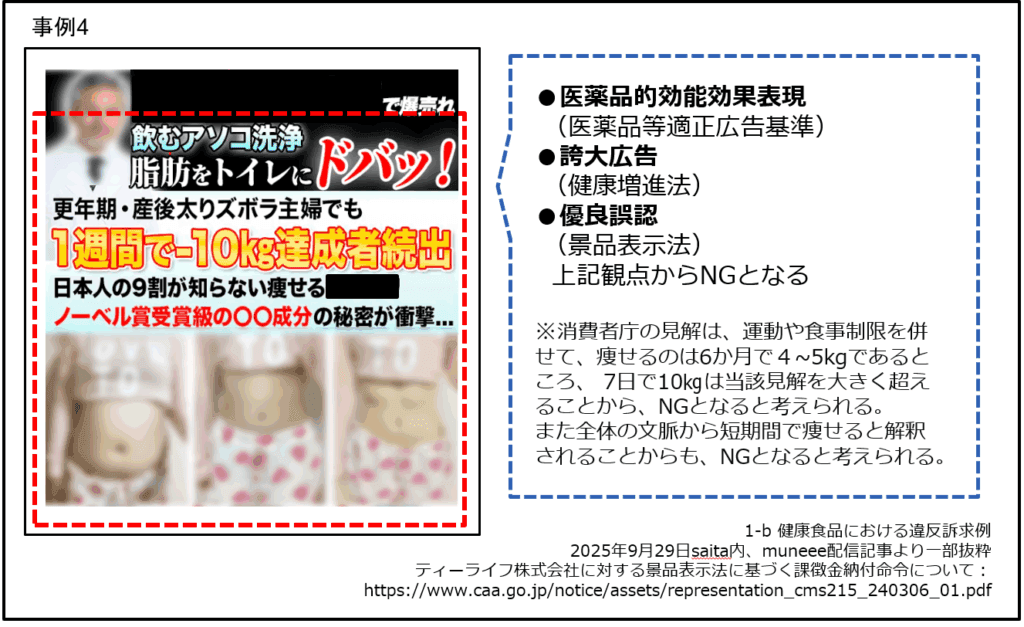 例:必ず痩せることができる、脂肪便を排出させる、代謝を上げてくれる、脂肪を燃焼させる、痩せ体質になれる、2週間で13.1kgの減量、BA画像との組み合わせで過度に痩せるような表現