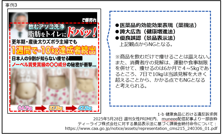 例:必ず痩せることができる、脂肪便を排出させる、代謝を上げてくれる、脂肪を燃焼させる、痩せ体質になれる、2週間で13.1kgの減量、BA画像との組み合わせで過度に痩せるような表現