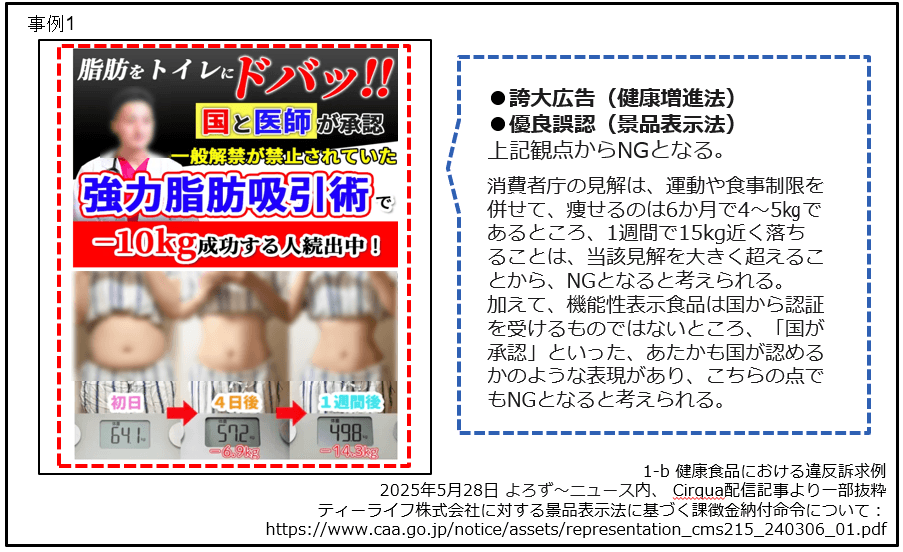 2. 機能性表示食品に該当する商材について、誇大広告(健康増進法)もしくは優良誤認(景品表示法)に違反している表現