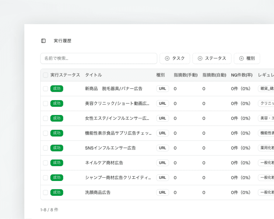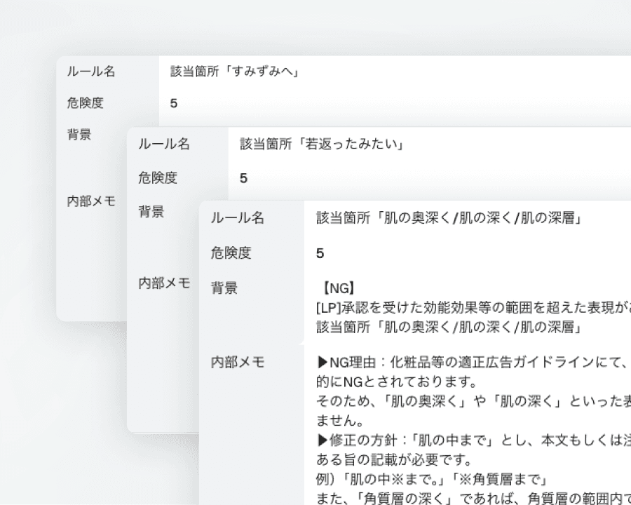 薬機法や景表法、医療広告ガイドラインはもちろんのこと、各社固有の「倫理観」「ブランド規定」「業界トレンド」に基づいたフルカスタムのチェック基準を設定可能です。汎用ツールでは難しい、貴社ならではの基準の標準化・自動化をサポートします。
